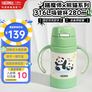旗舰店膳魔师儿童水杯316L保温杯带把手婴儿水杯宝宝吸管杯幼儿园学生水杯TCKK 熊猫 竹叶青280ml
