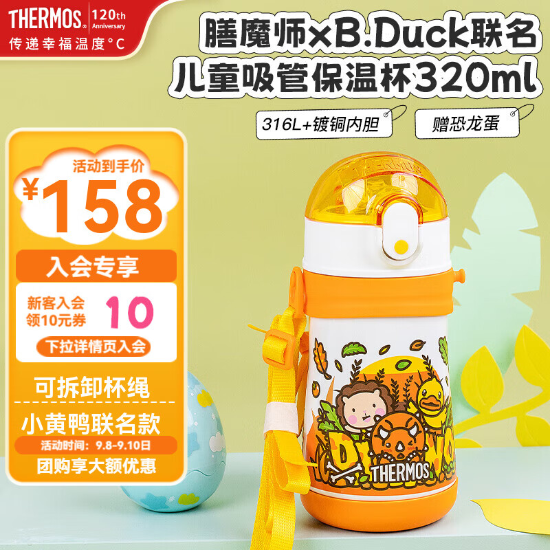 旗舰店膳魔师(THERMOS)儿童水杯316l不锈钢保温杯宝宝水杯小学生吸管杯耐磨防摔可斜跨 黄恐龙 320ml (带杯绳+恐龙蛋)